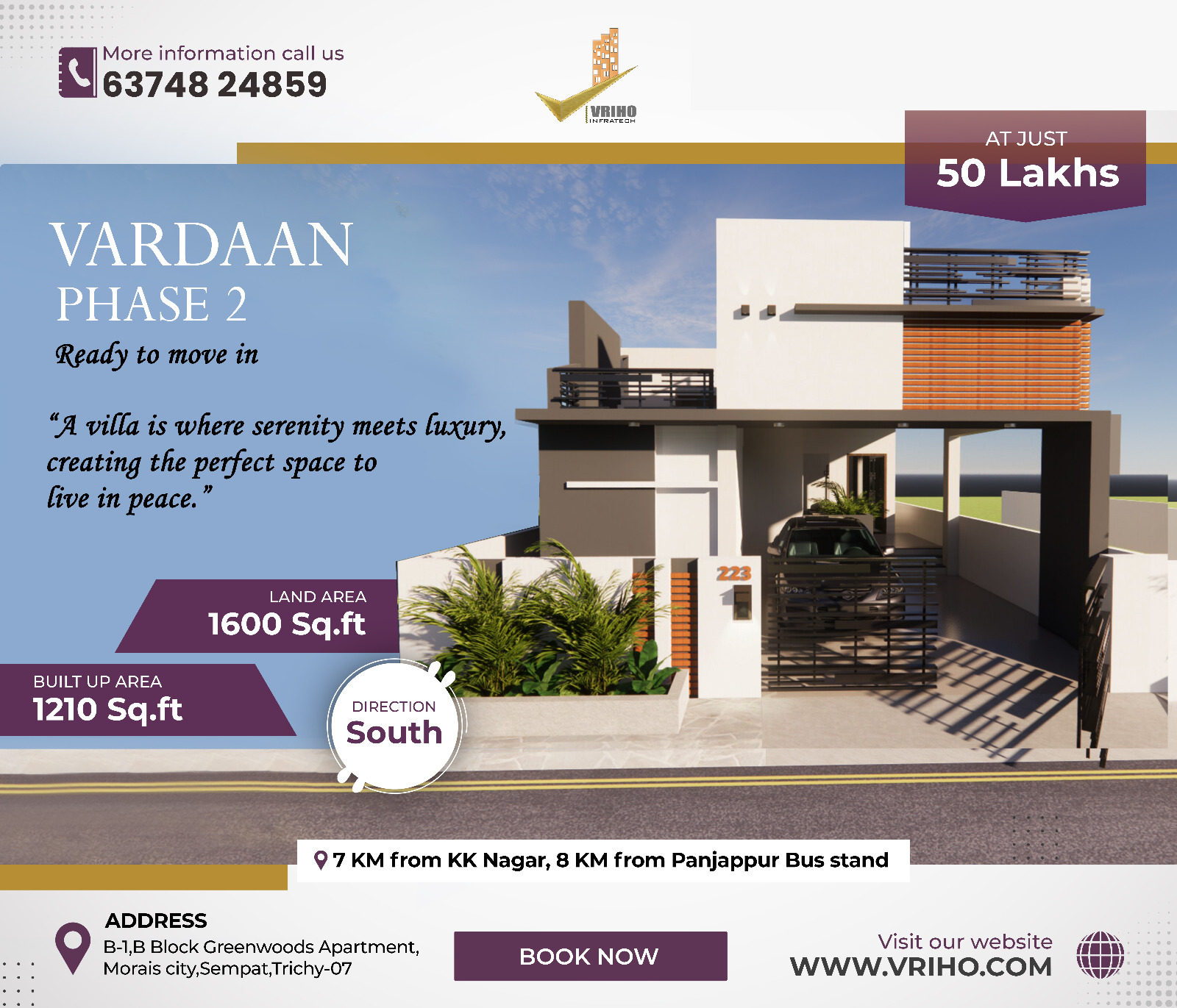 VARDAN Phase 2 – Luxury Ready to Move Villa or Houses in Iraivan Nagar, MulliPatti near 7 kms from KK Nagar and 8 kms from Trichy Panjappur Bus Stand in Trichy City